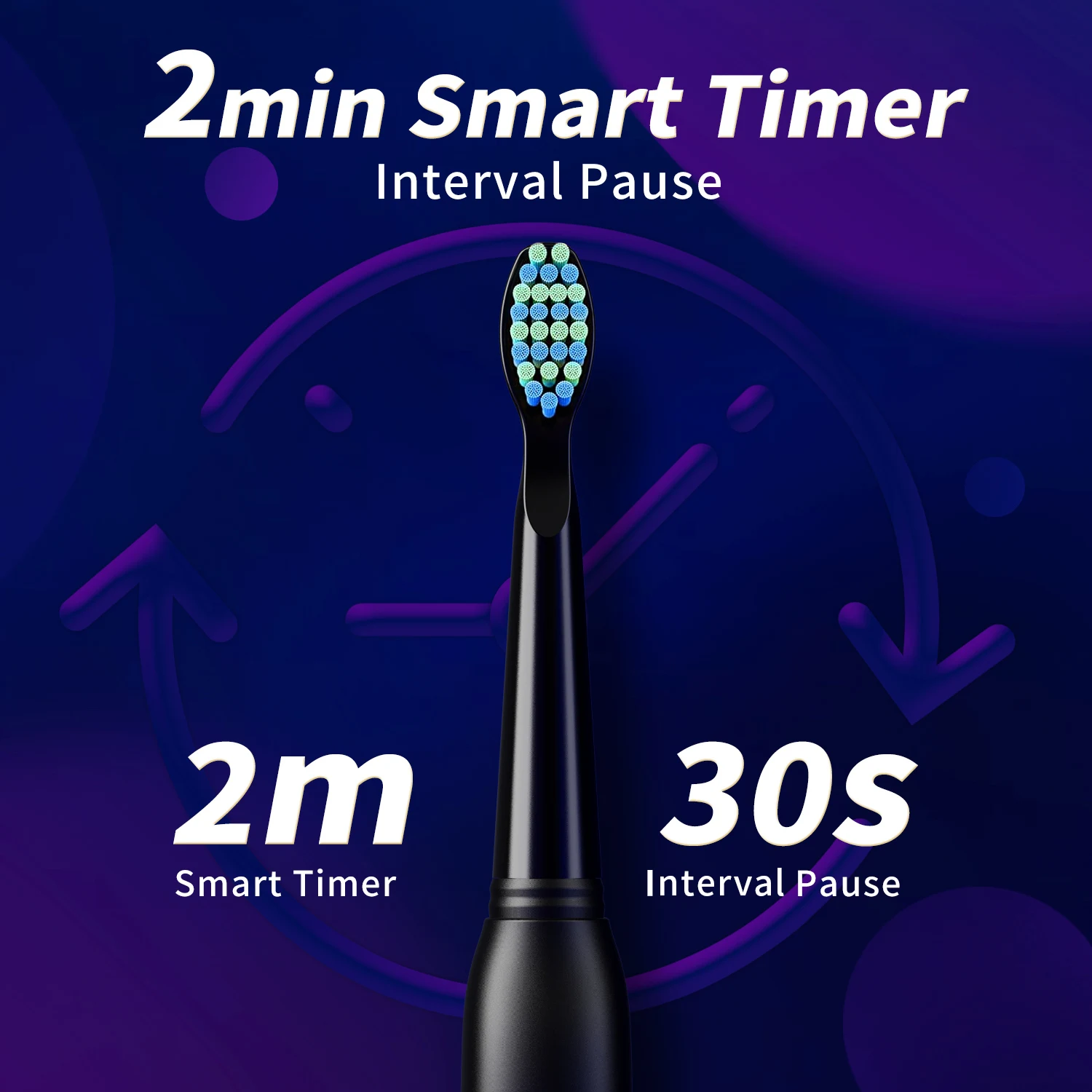 3) 2 분 자동 타이머는 치과의사가 권장하는 칫솔질 시간, 30 초 간격을 보장하여 입의 사분면 전체 브러쉬를 철저히 닦습니다.