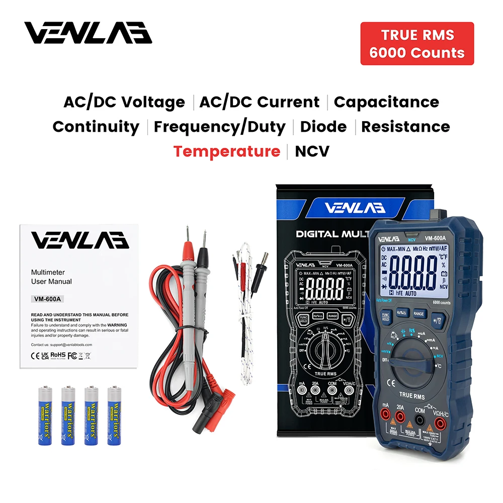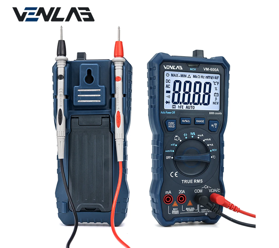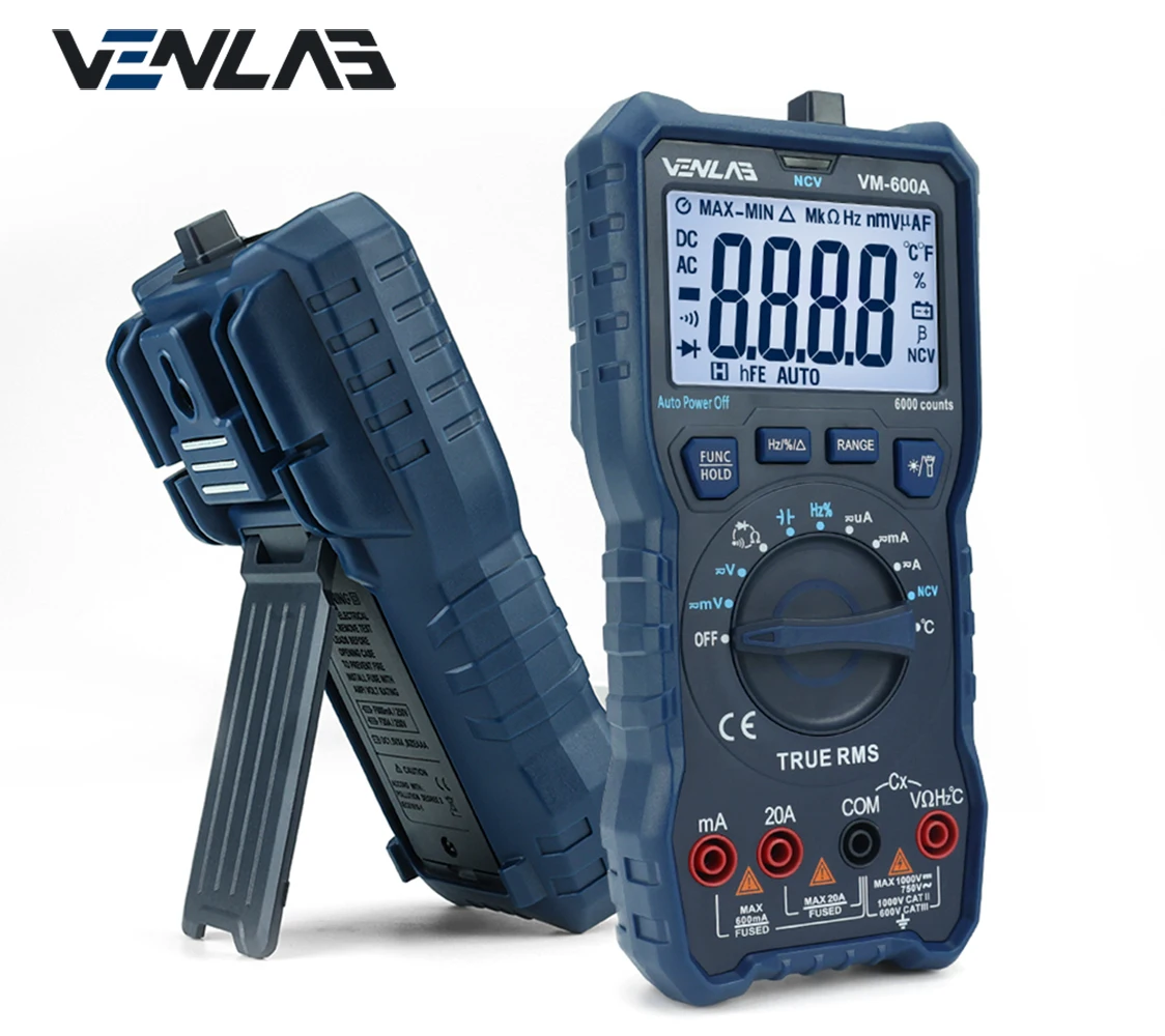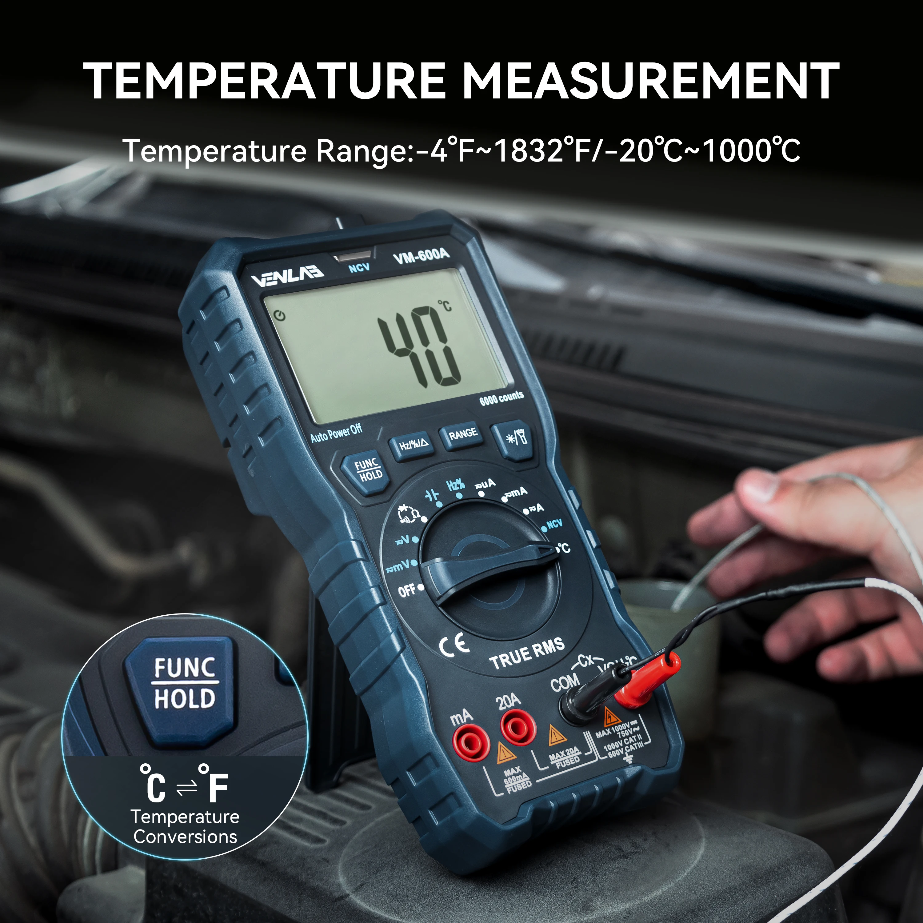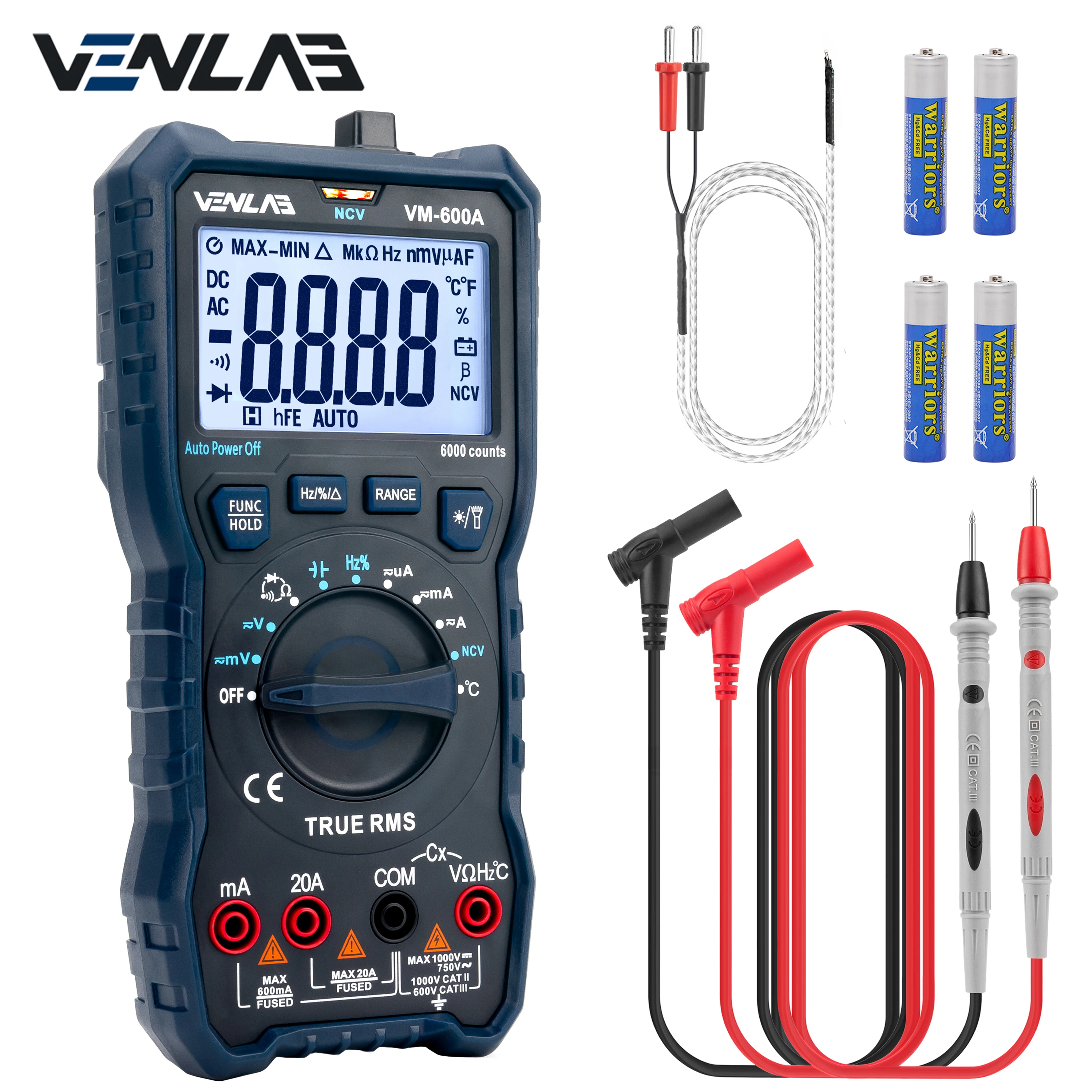 VENLAB VM-600A 멀티미터는 최대 600V AC/DC 전압, 10A AC/DC 전류 및 60 MOhms 저항을 측정하며 전기 테스터는 온도, 커패시턴스, 주파수, 듀티 사이클, 와이어 온-오프, 테스트 다이오드 및 연속성.