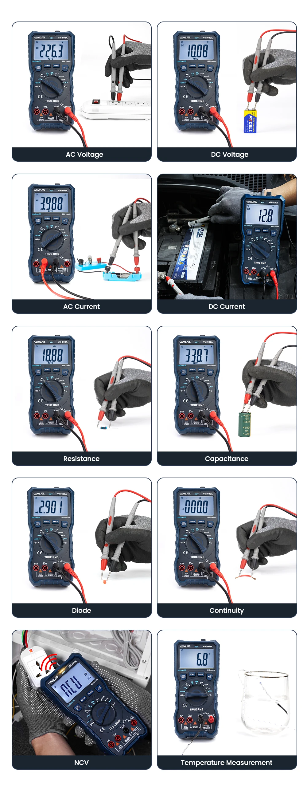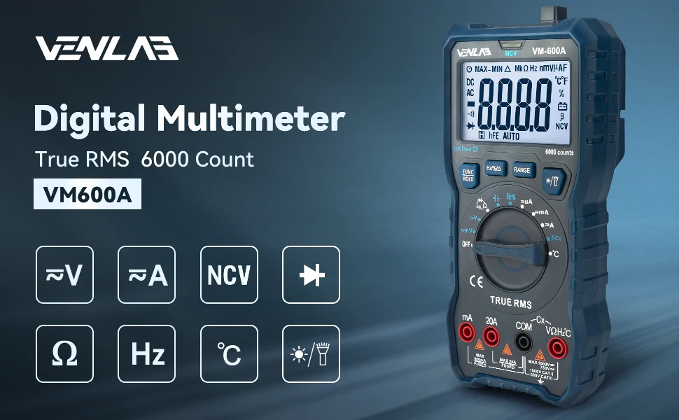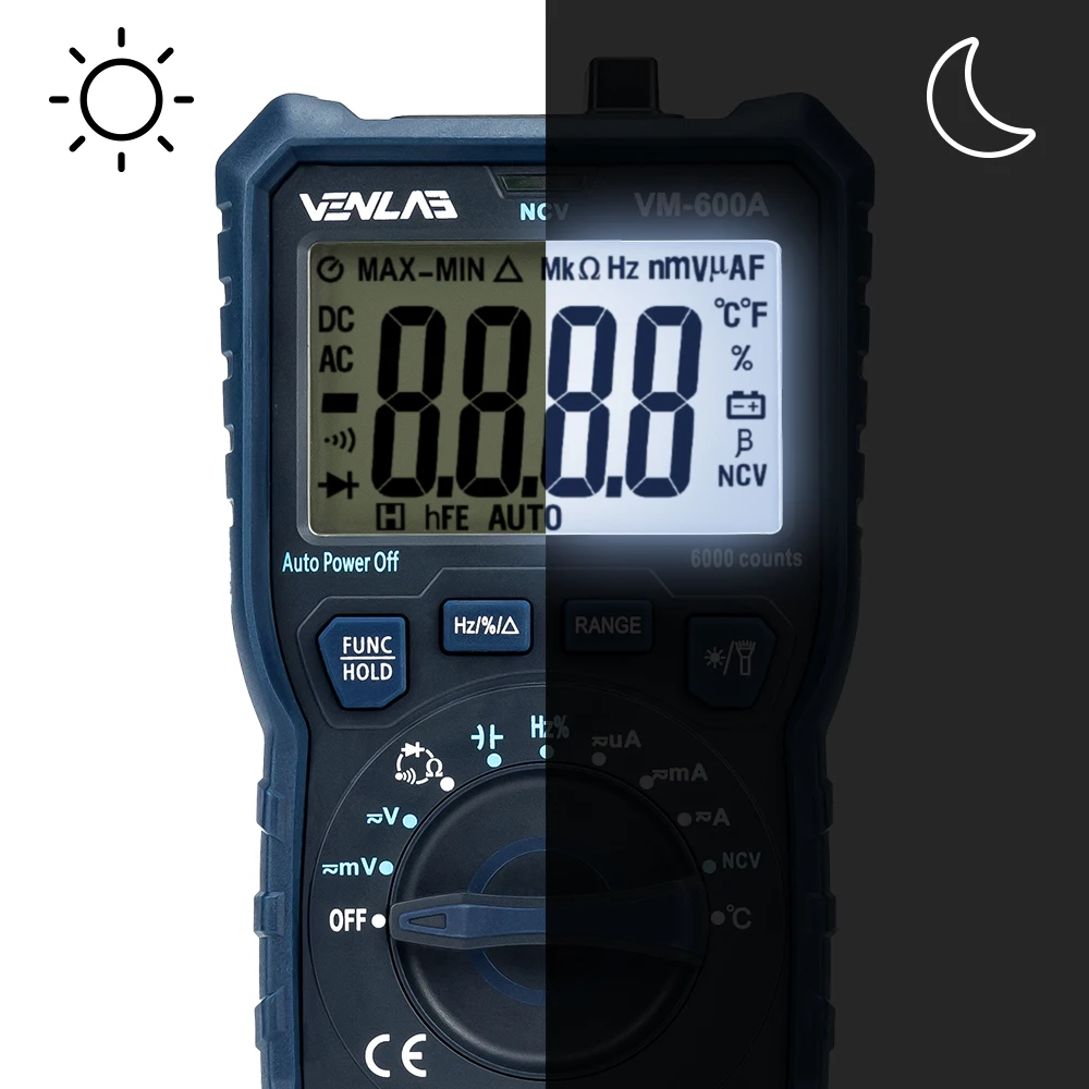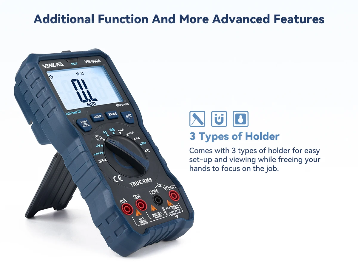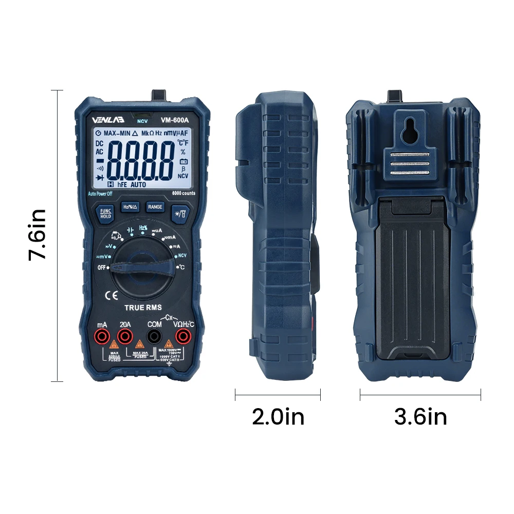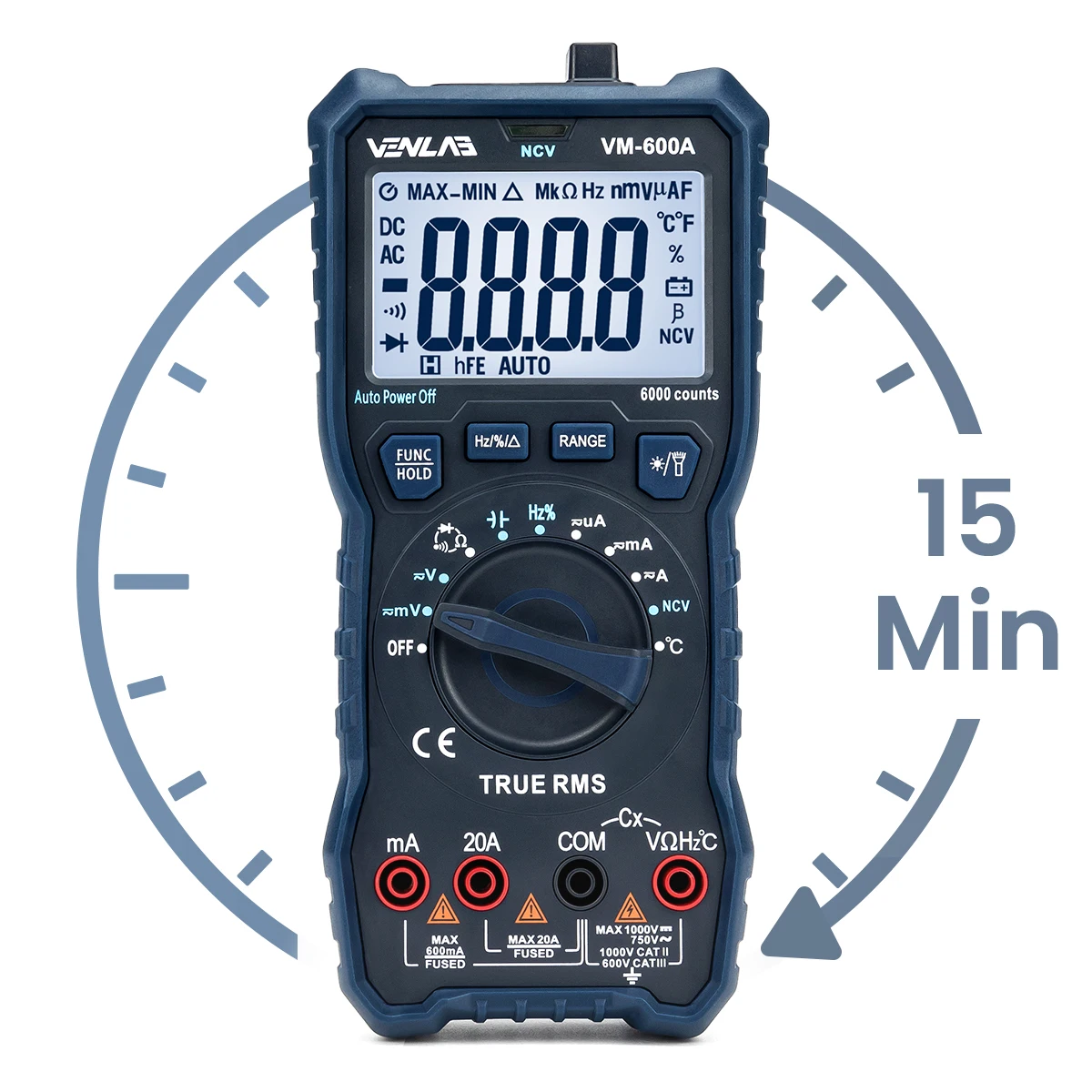 VENLAB VM-600A 멀티미터는 최대 600V AC/DC 전압, 10A AC/DC 전류 및 60 MOhms 저항을 측정하며 전기 테스터는 온도, 커패시턴스, 주파수, 듀티 사이클, 와이어 온-오프, 테스트 다이오드 및 연속성.