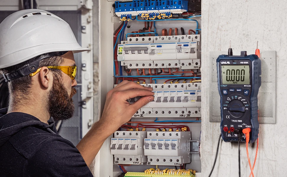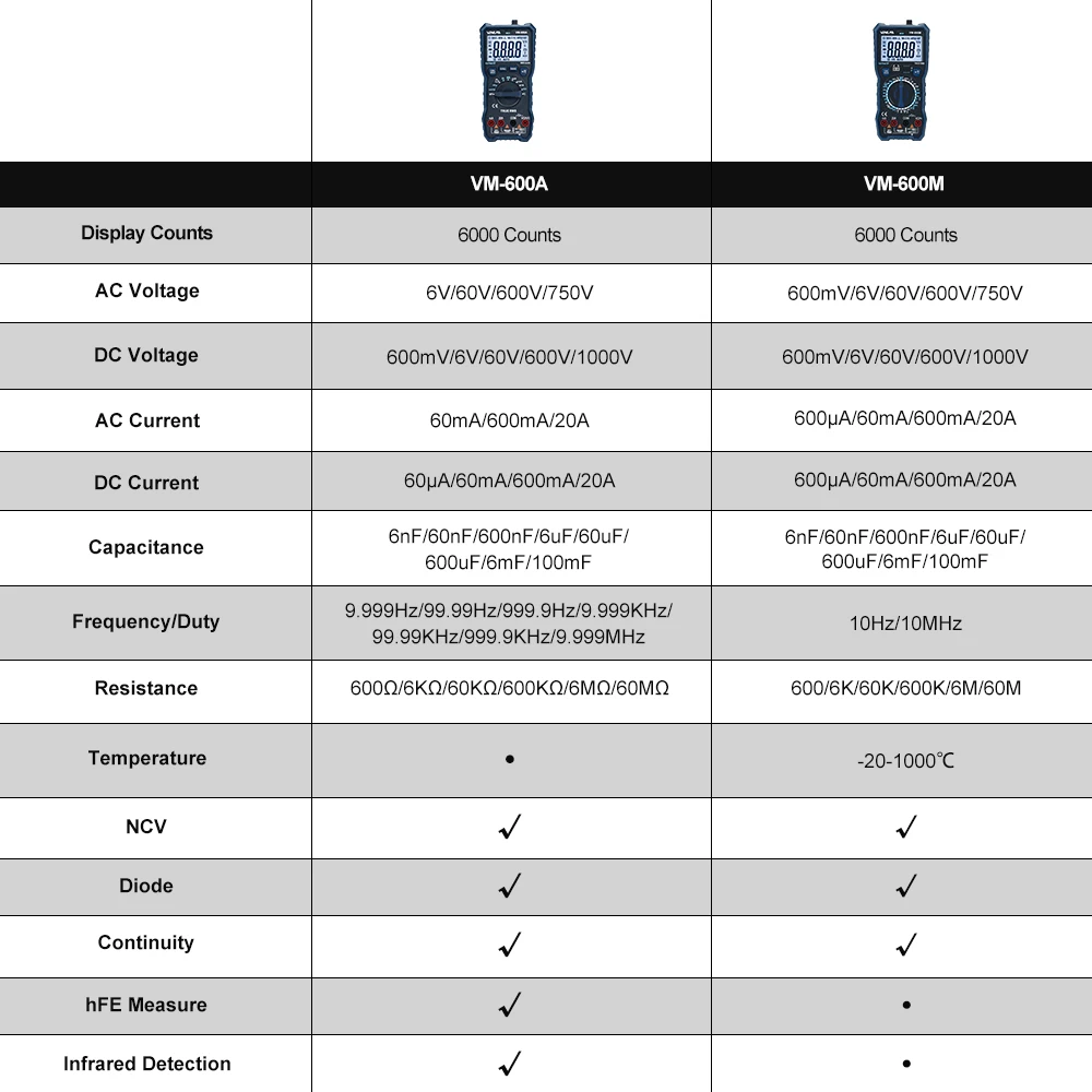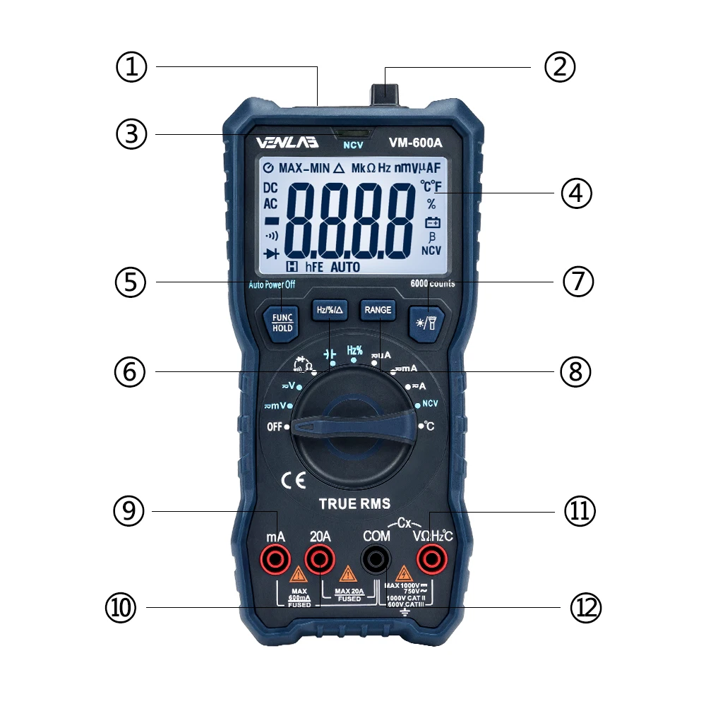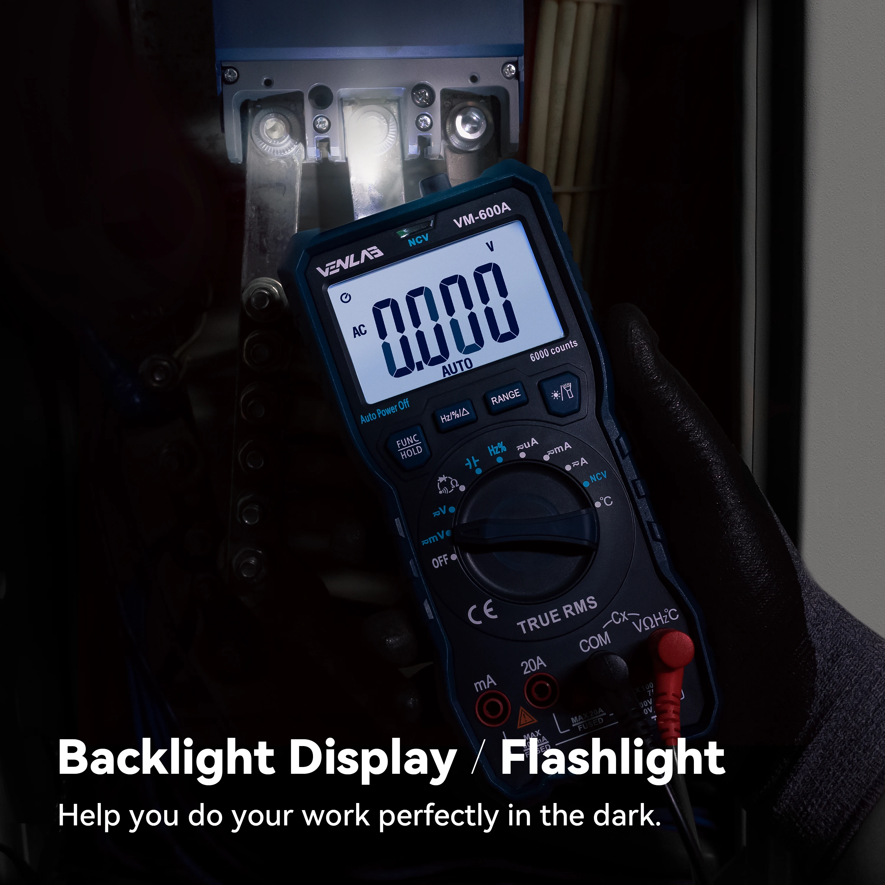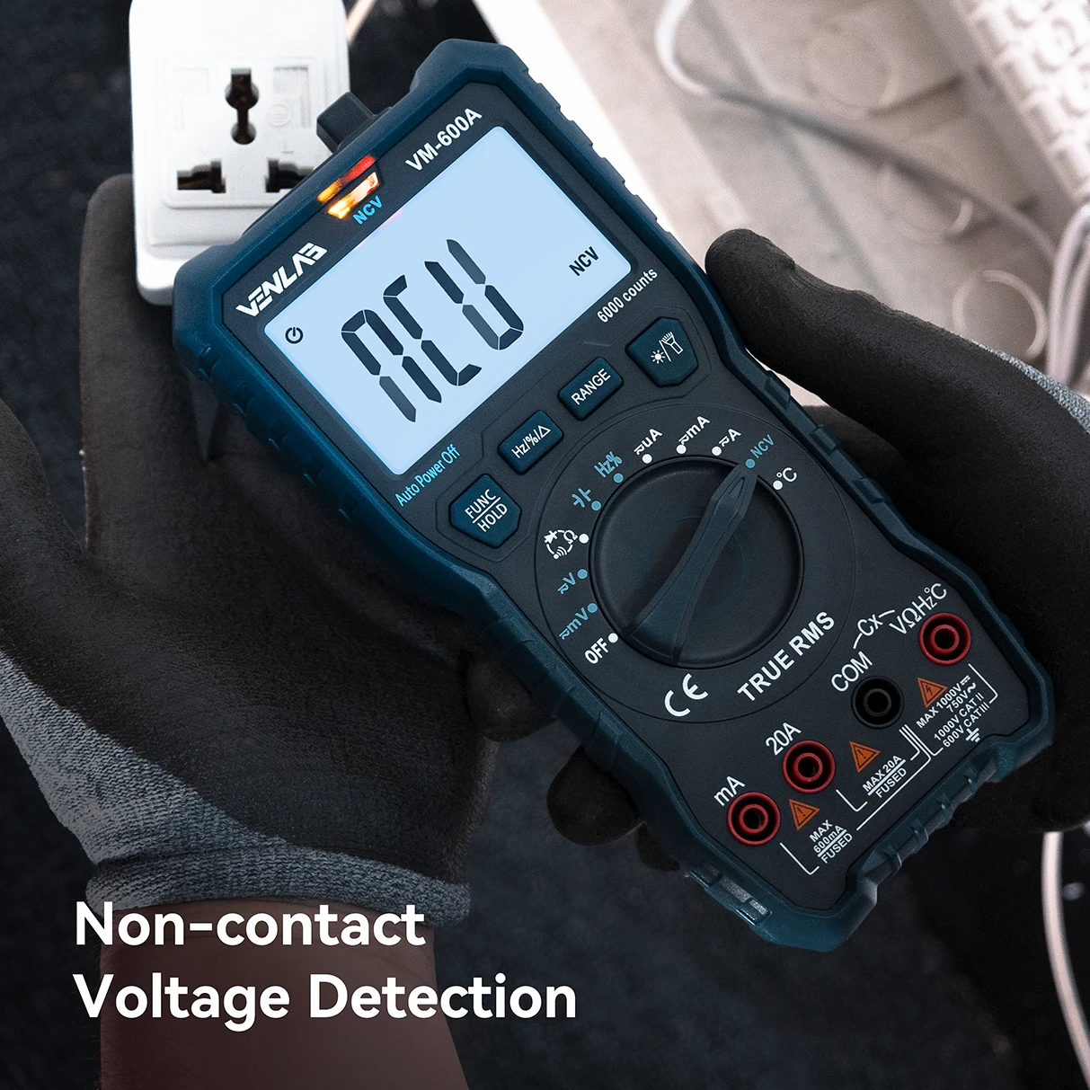 VENLAB VM-600A 멀티미터는 최대 600V AC/DC 전압, 10A AC/DC 전류 및 60 MOhms 저항을 측정하며 전기 테스터는 온도, 커패시턴스, 주파수, 듀티 사이클, 와이어 온-오프, 테스트 다이오드 및 연속성.