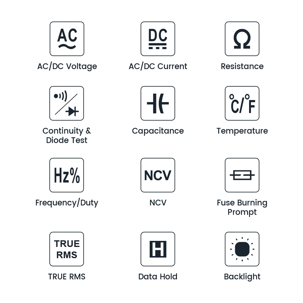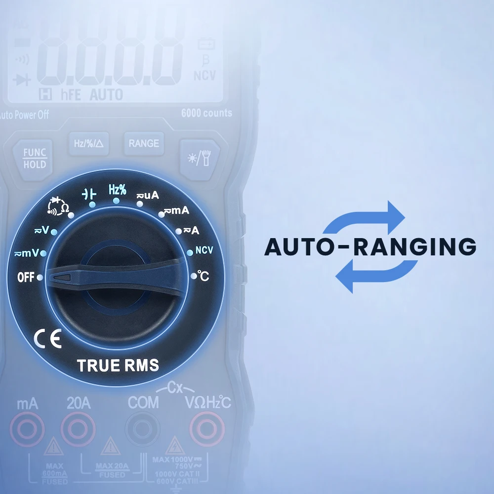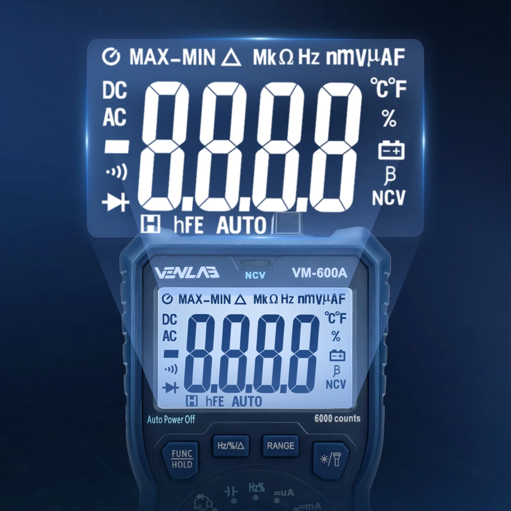 다이얼을 필요한 기능으로 전환하십시오. 자동 범위 조정 기능은 가치 범위를 알아야하는 번거로움을 덜어줍니다. 대형 2.9 인치 LCD 백라이트 디스플레이, 읽기 쉬운 숫자는 6000 카운트 해상도를 제공합니다.