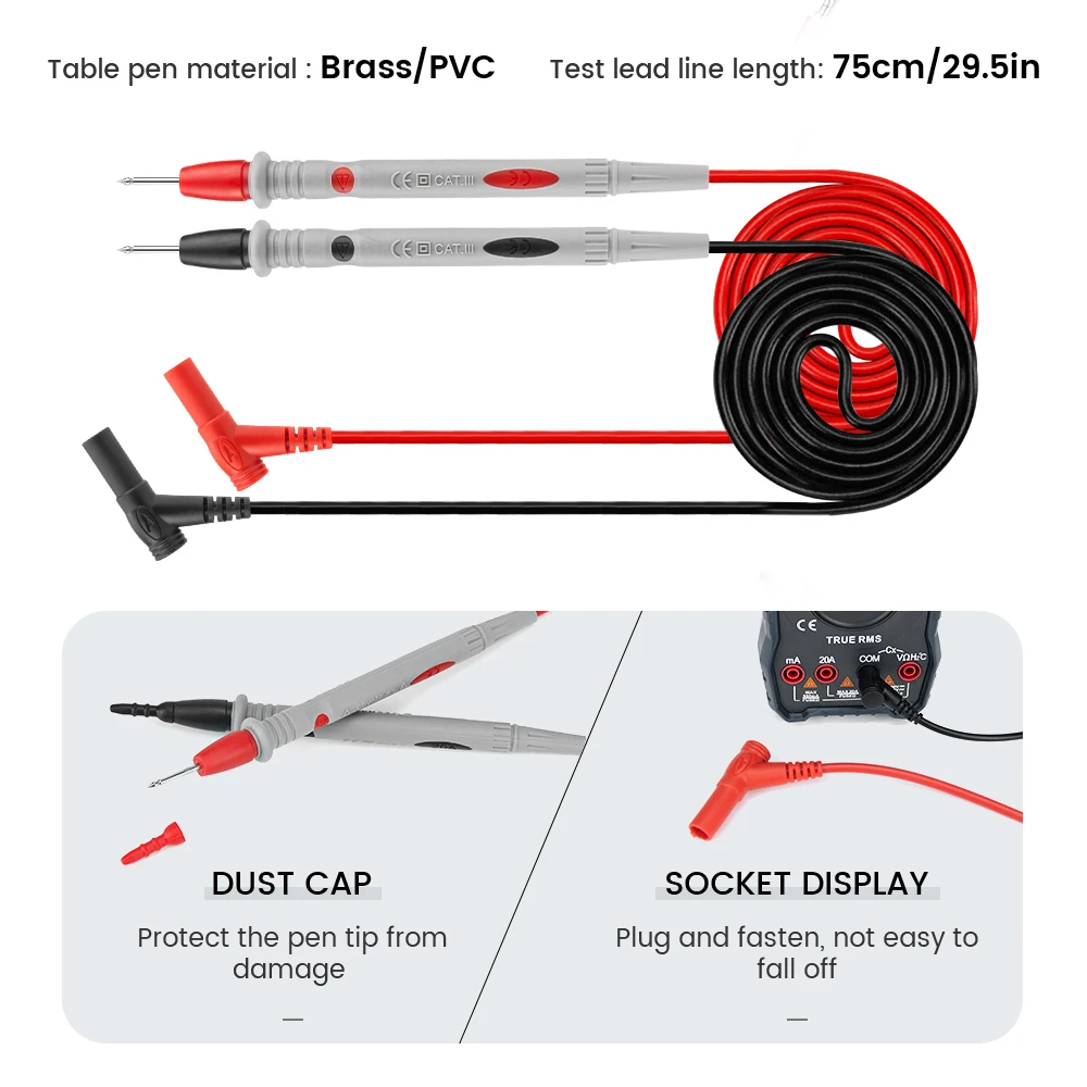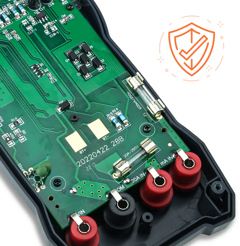 IEC 등급 고양이. III 1000V, CAT.IV 600V, CE 및 RoHS 인증. 이중 퓨즈 및 과부하 보호 기능으로 화상 방지. 실리콘 커버는 추가적인 낙하 방지 기능을 제공하며 일상적인 작업복을 견딜 수 있습니다.
