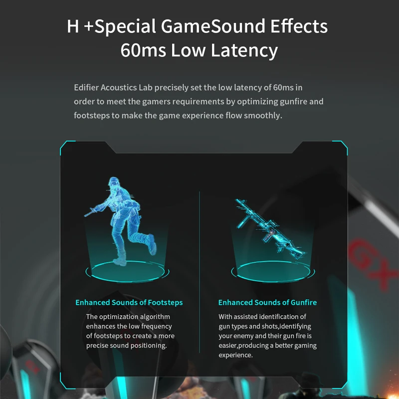 Edifier Acoustics Lab은 게임 경험이 원활하게 흐르도록 총성과 발자국을 최적화하여 게이머 요구 사항을 충족시키기 위해 60ms 의 낮은 대기 시간을 정확하게 설정합니다.