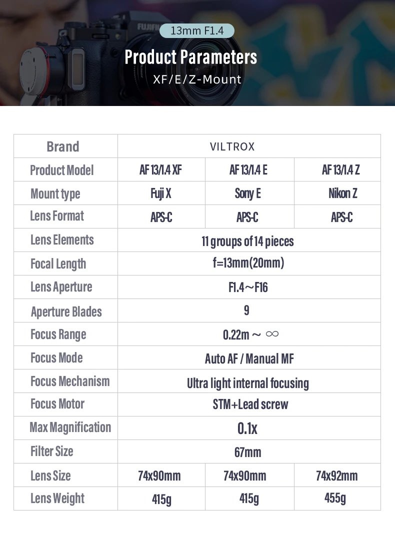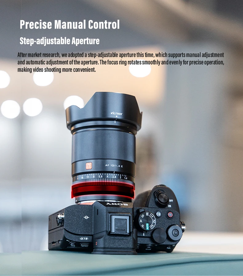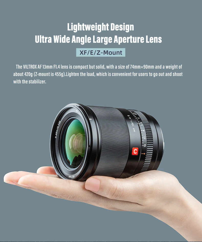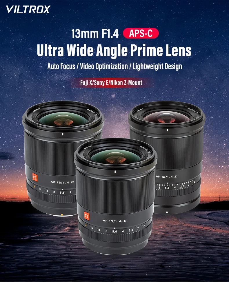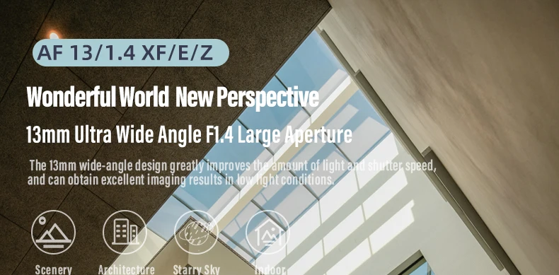 일반적으로 초광각 렌즈의 조리개는 비교적 작지만 VILTROX AF 13mm F1.4 렌즈는 13mm 로 구성됩니다.