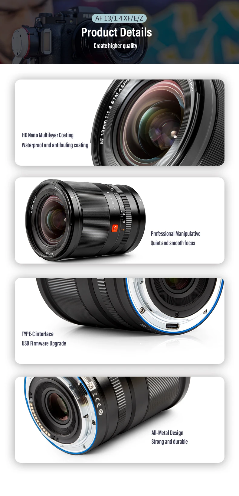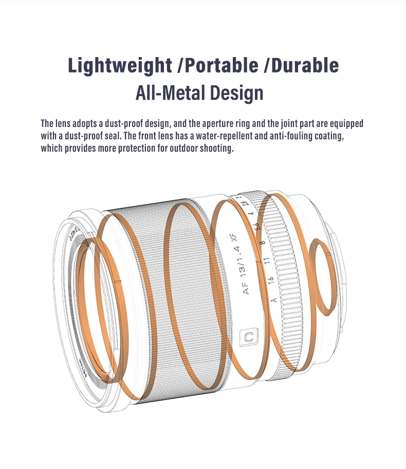 VILTROX AF13mm F1.4 바디는 올 메탈 디자인, 정밀 황동 도금 총검, 강하고 내구성,