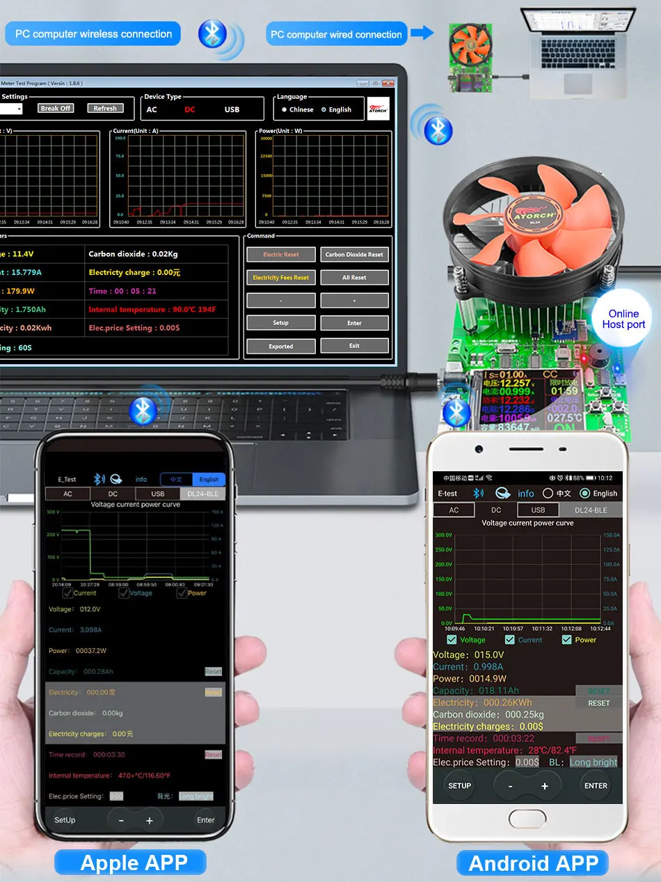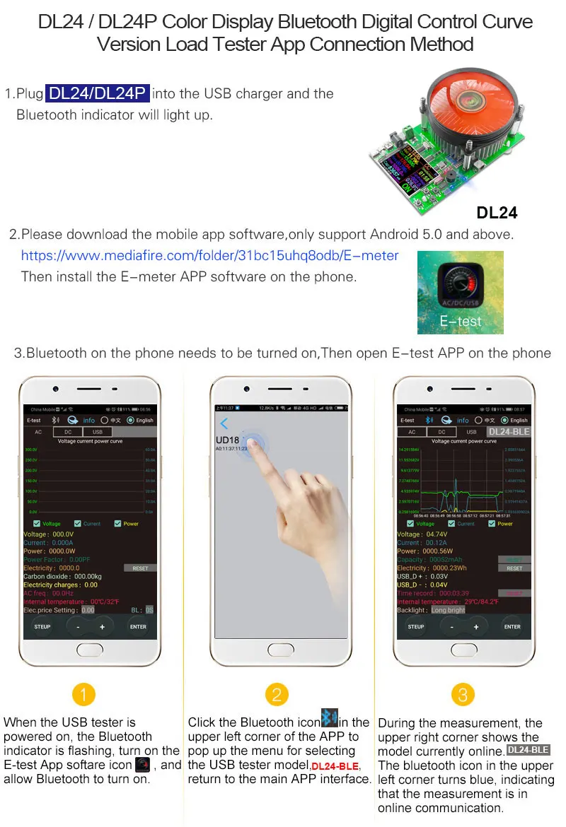 호스트 뒷면의 QR 코드를 스캔하여 해당 APP 소프트웨어 또는 Android APP를 다운로드하십시오. Google에서 E-테스트를 다운로드하여 다운로드하십시오. 설치가 완료되면 소프트웨어를 열고 Bluetooth 아이콘을 클릭하여 온라인으로 성공적으로 사용하려면 직접 DL24-BLE 선택을 입력하십시오. (블루투스 페어링이 필요 없으며 소프트웨어 블루투스 아이콘이 DL24 을 직접 선택합니다. can)