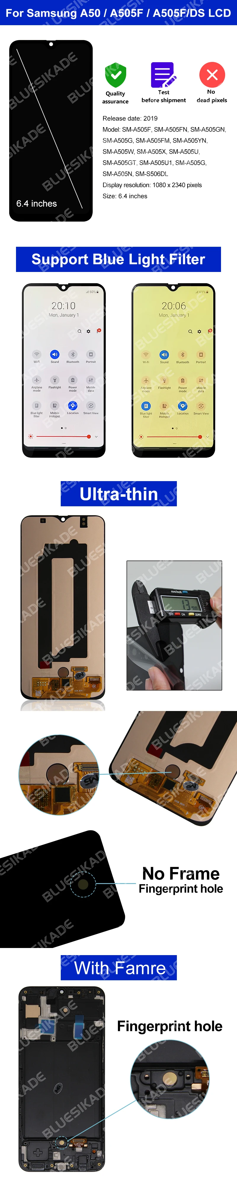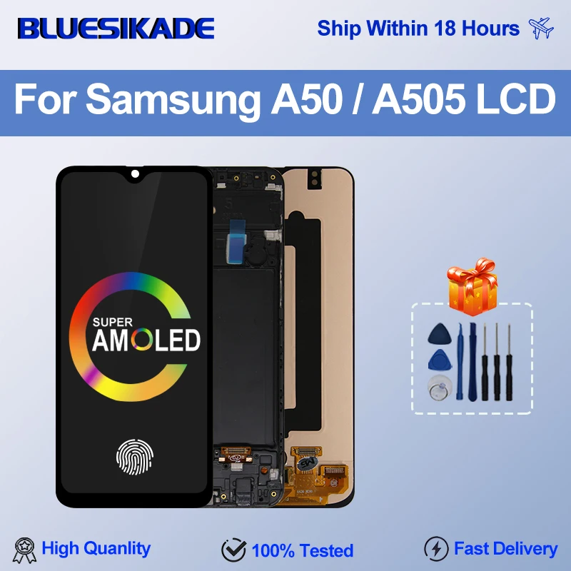 삼성 A505FN/DS A505F/DS A505F/DS A505 LCD 용 프레임이있는 삼성 갤럭시 A50 LCD 디스플레이 터치 스크린 디지타이저 용 6.4 “슈퍼 AMOLED
