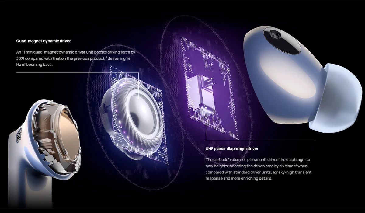 3. 구동 영역의 백분율은 음성 코일과 전체 다이어프램에 접촉하는 유효 다이어프램 영역의 백분율을 나타내며, 이는 HUAWEI FreeBuds Pro보다 6 배 높습니다. 데이터는 화웨이 실험실에서 제공됩니다.