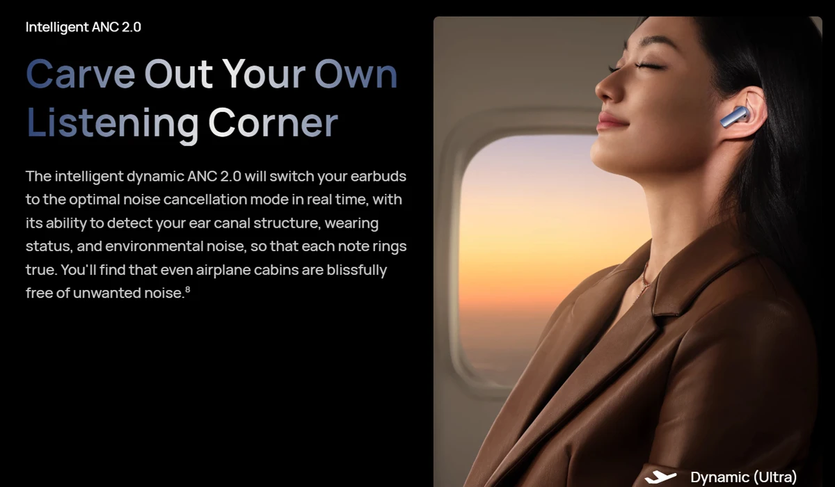 지능형 동적 ANC 2.0 귀 운하 구조, 착용 상태 및 환경 소음을 감지 할 수있는 능력으로 실시간으로 최적의 소음 제거 모드로 이어 버드를 전환합니다. 그래서 각 음표는 진실로 울립니다. 비행기 선실조차도 원치 않는 소음이 없음을 알게 될 것입니다.