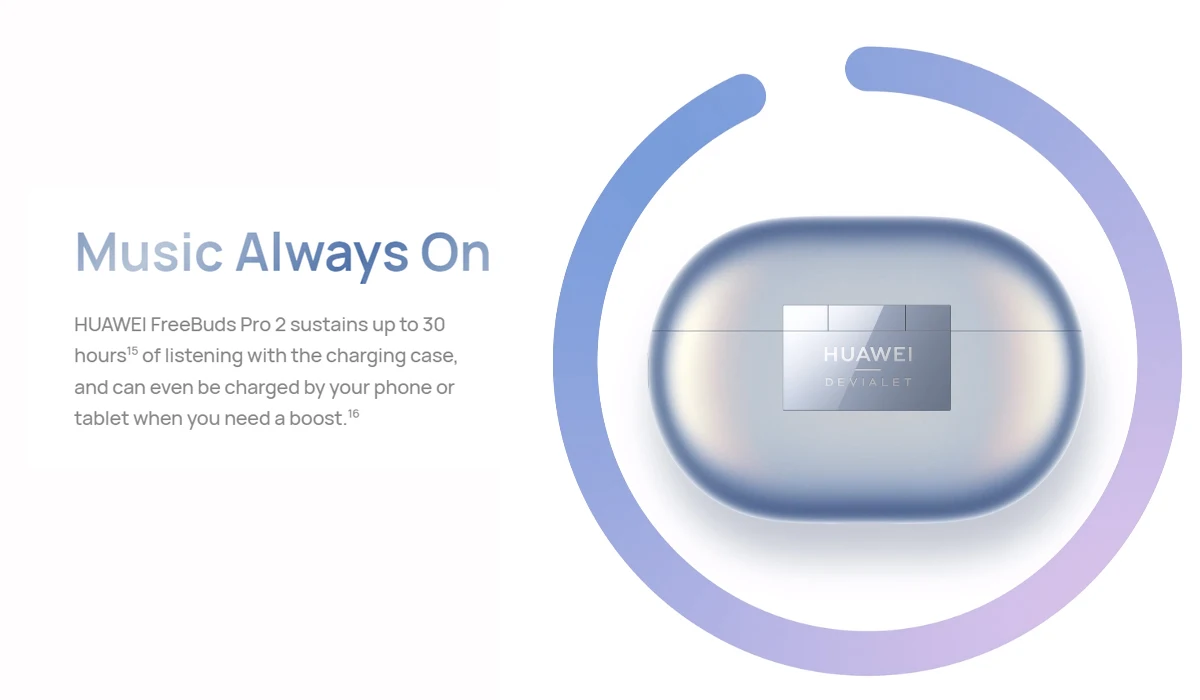 HUAWEI Freebuds Pro 2 는 충전 케이스로 최대 30 시간 동안 청취 할 수 있으며 부스트가 필요할 때 휴대 전화 나 태블릿으로 충전 할 수도 있습니다.