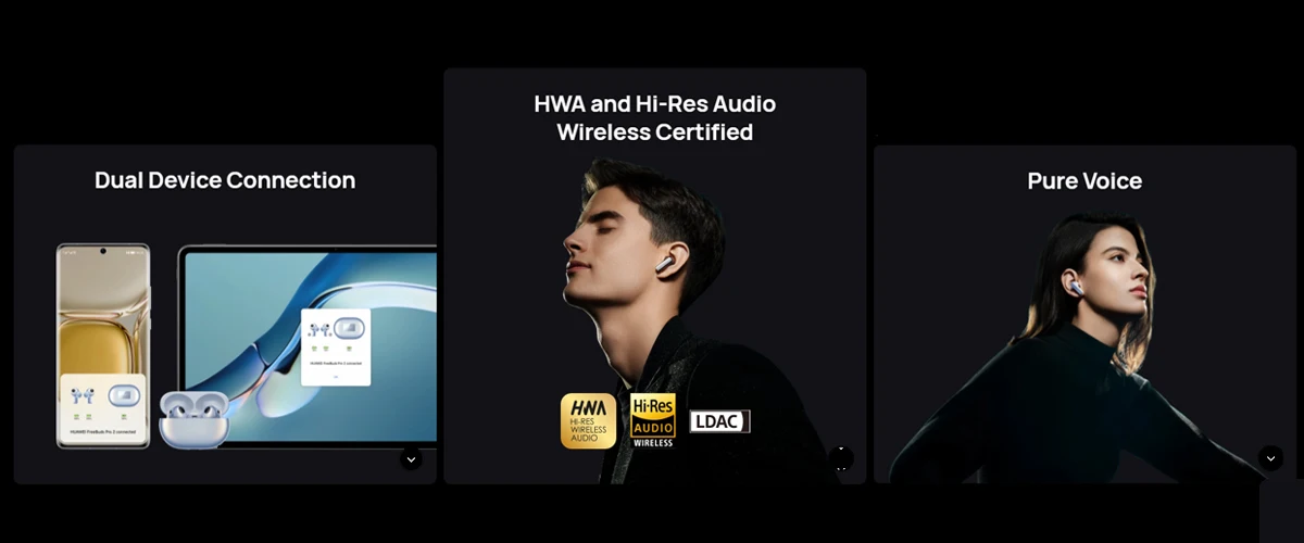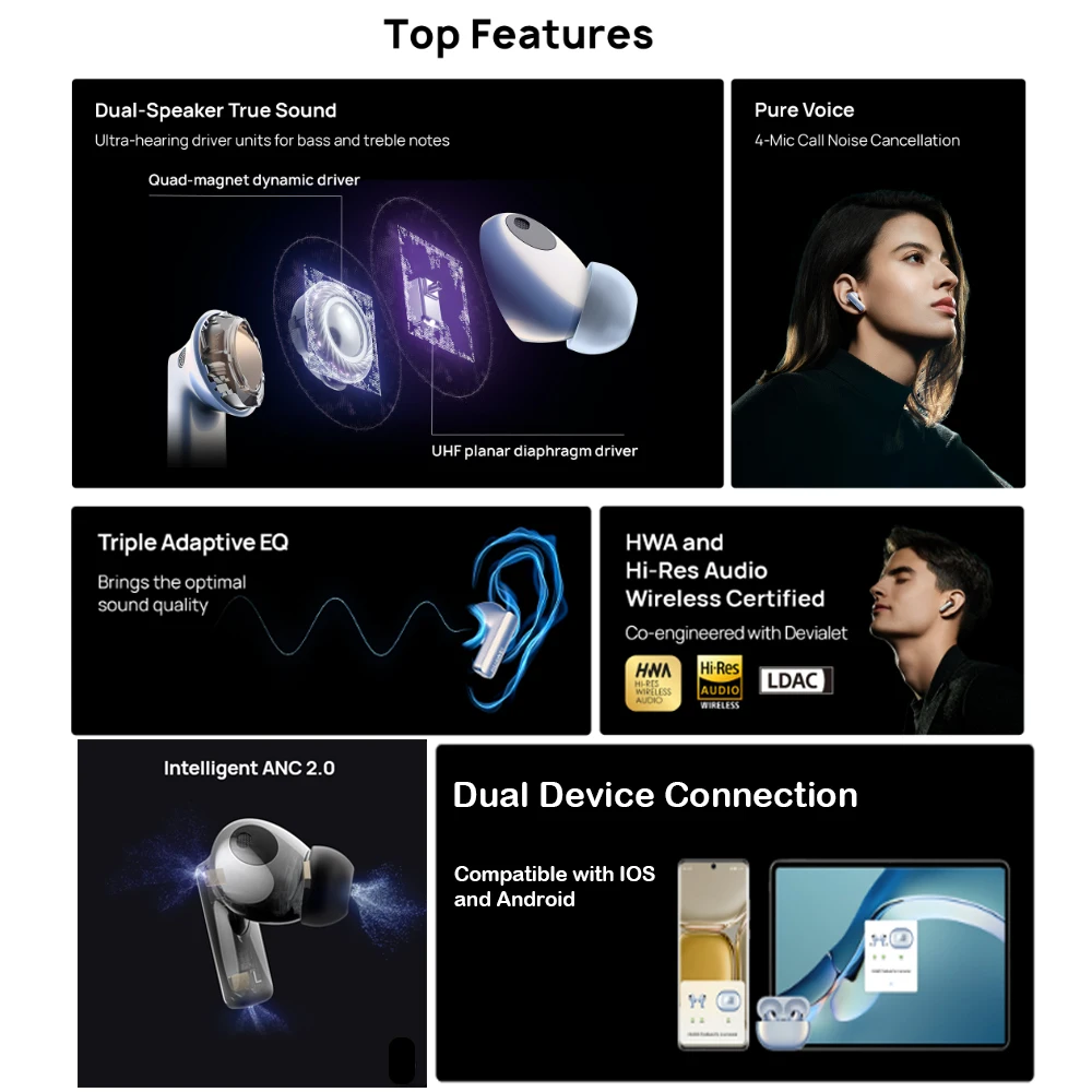 HUAWEI Freebuds Pro 2 에 귀를 빌려 풍부한 사운드, 질감, 그리고 14 Hz에서 48 kHz까지의 청각 범위를 훨씬 초과하는 디테일-고음, 급상승 저음 및 그 사이의 모든 것.