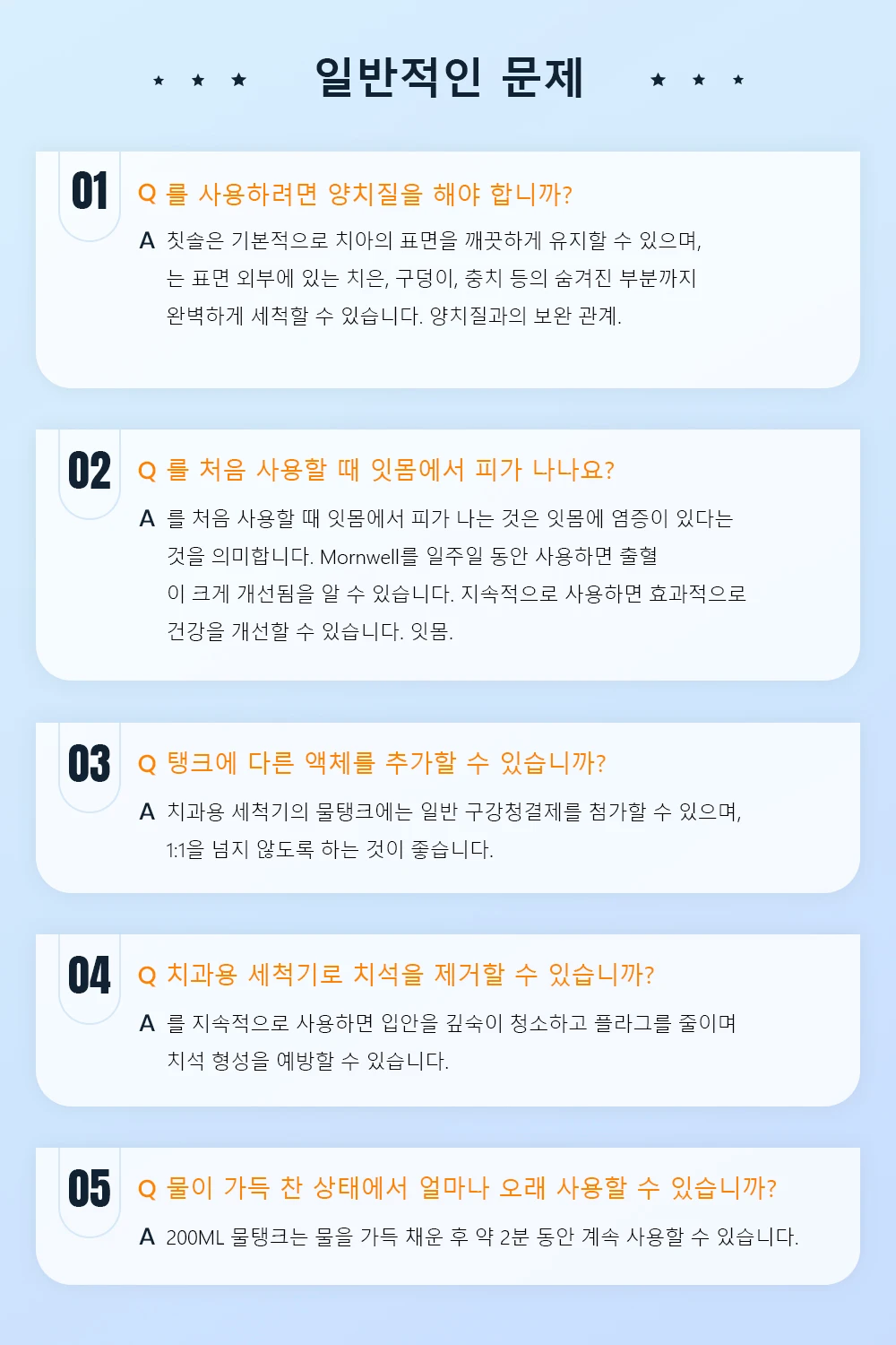 압력과 맥박의 최적 조합을 사용하여, Mornwell f18는 부류와 철사에서 상패 그리고 음식 입자를 제거하고, 잇몸을 완화하고 자극합니다. 이러한 행동은 잇몸 건강을 개선하면서 치아와 하드웨어 주위의 플라크를 줄이는 데 도움이됩니다.