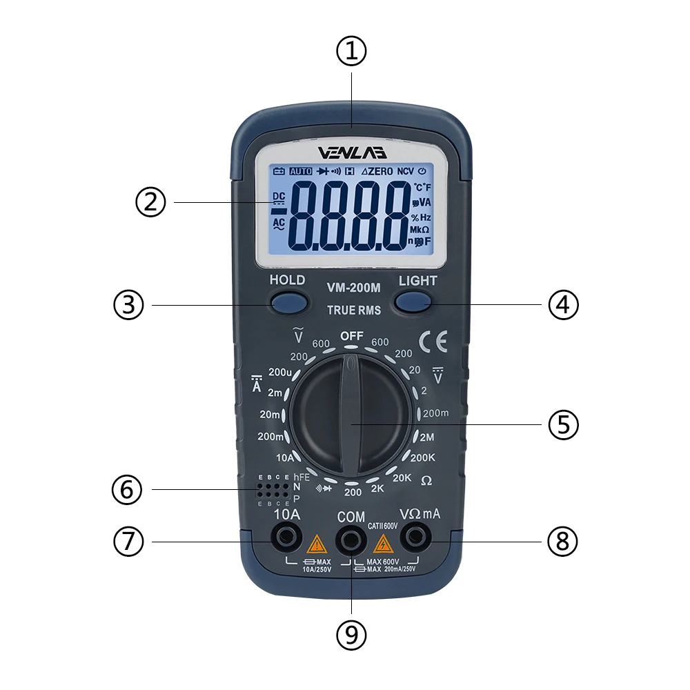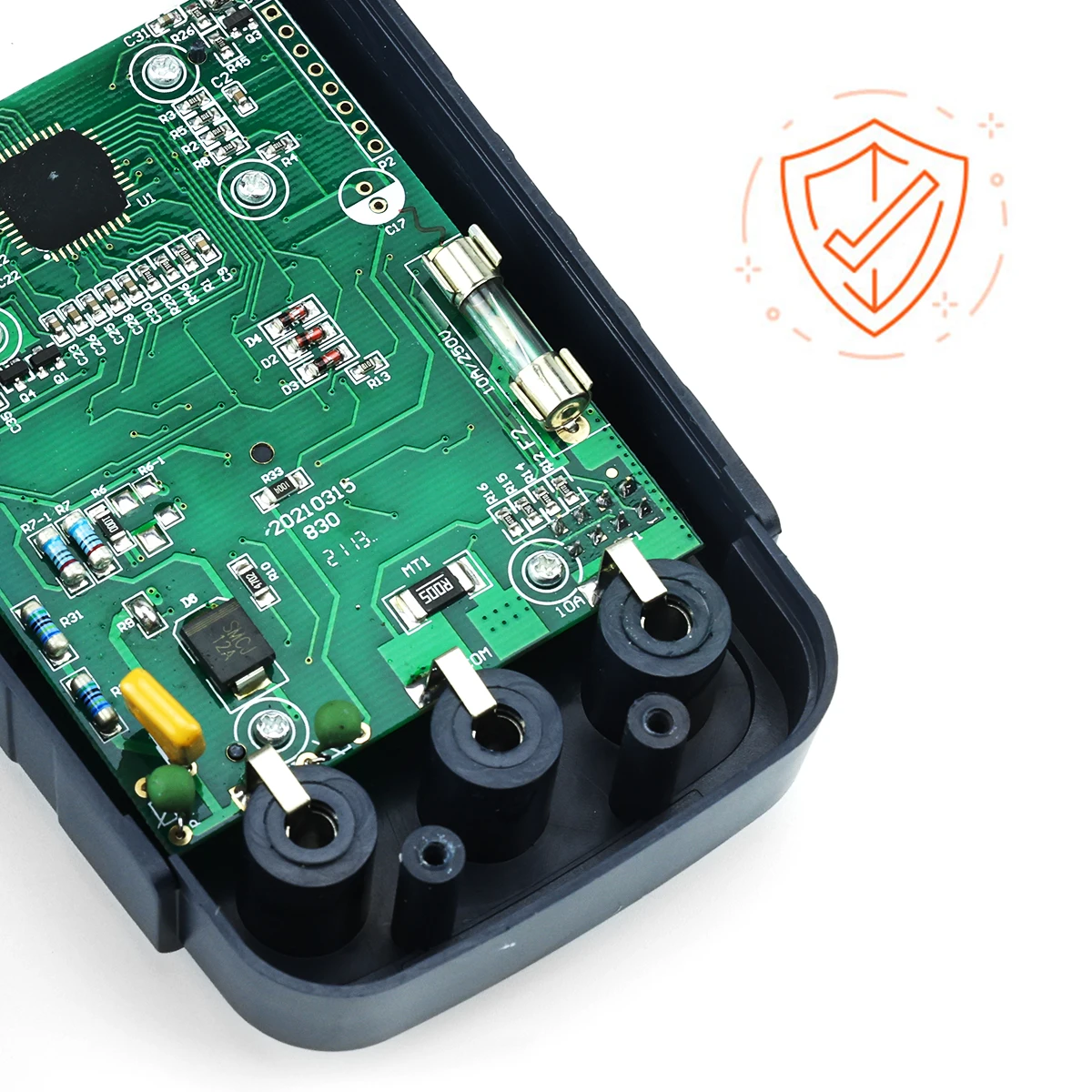 IEC 등급 CAT III 600V, CE 및 RoHS 인증. 이중 퓨즈로 화상 방지. 이 멀티 미터는 모든 범위에서 과부하 보호 기능이 있습니다.