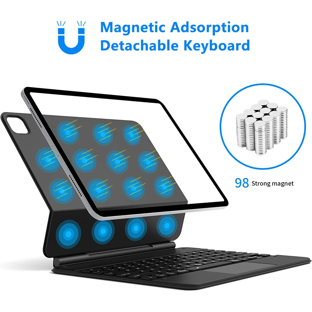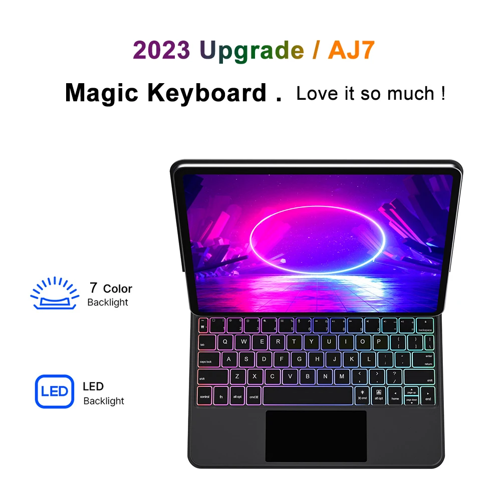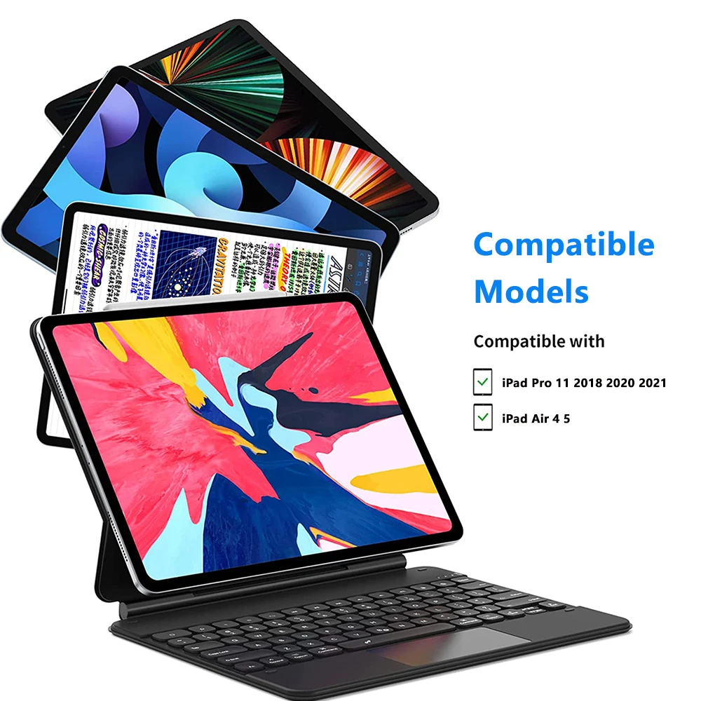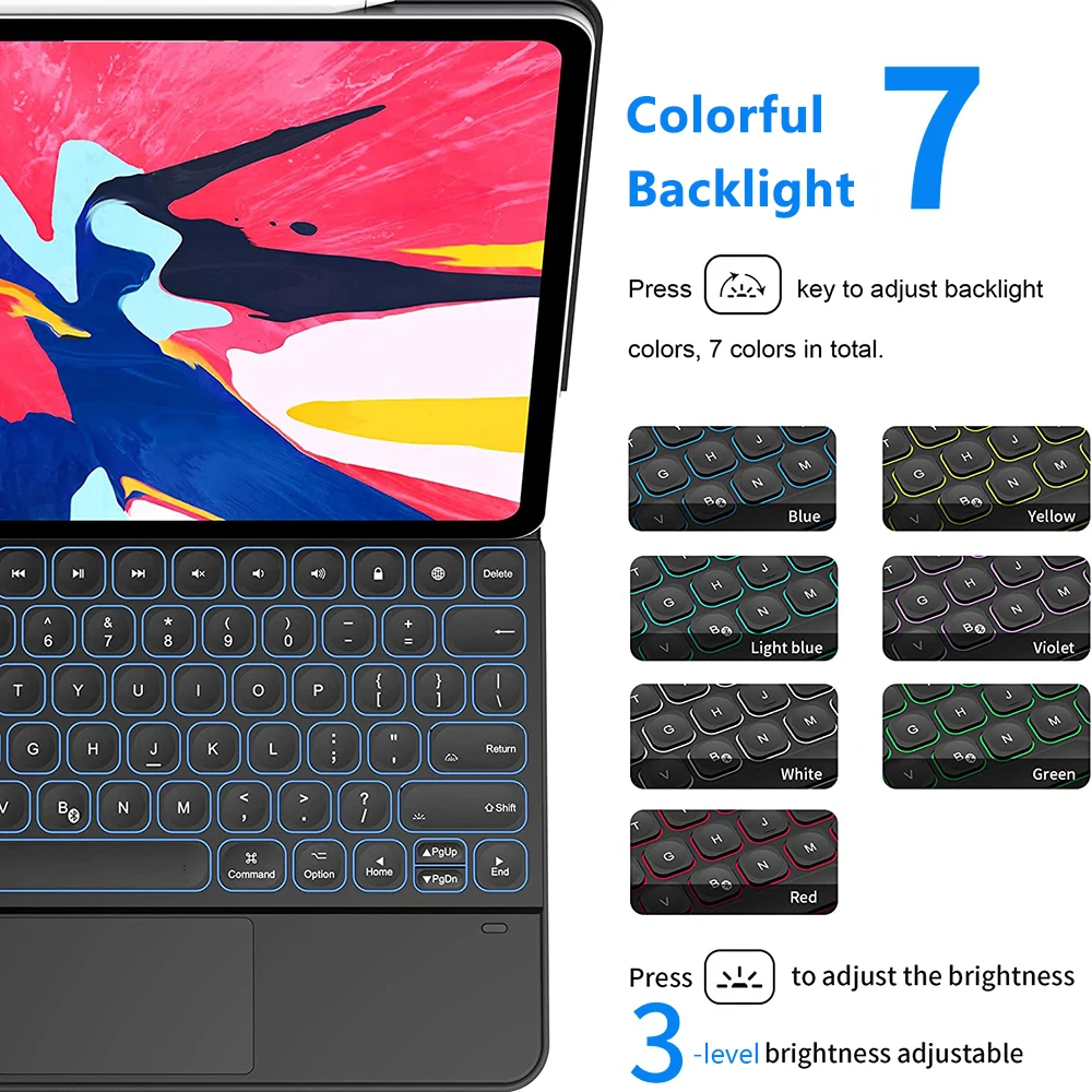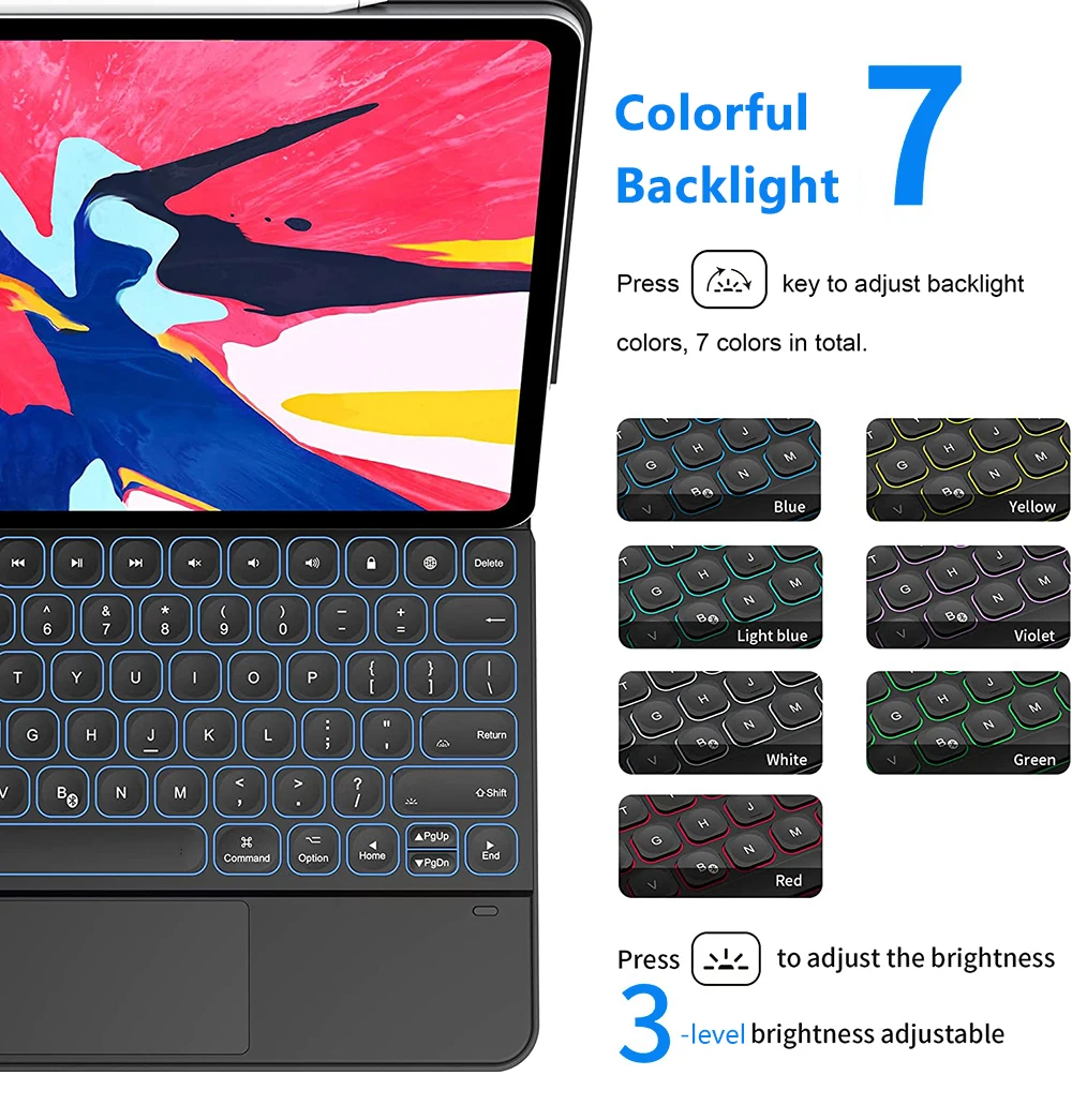 단축키가있는 7 색 백라이트 키보드-어두운 방에서도 키보드로 프로 11 인치 및 에어 5/4 케이스에 정확하게 입력, 인체 공학적 키, 7 색 백라이트, 3 개의 조절 가능한 백라이트 밝기 레벨, 편안한 타이핑 경험을 제공하십시오. 더 이상 기본 기능을 검색하지 않고, 이 프로 11 & 에어 5/4 키보드로 더 효율적으로 파도스 단축키를 사용하여 밝기 레벨을 조정하고, 백라이트 색상, 미디어, 볼륨 컨트롤, 그리고 한 번의 탭으로 더.