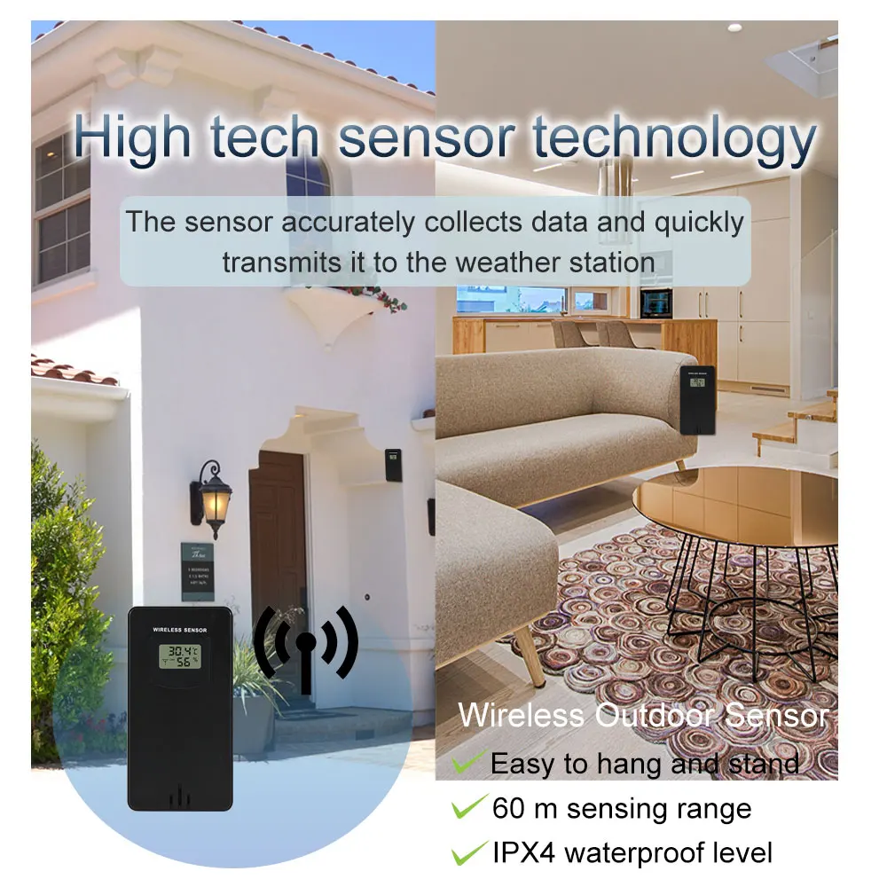 3 채널 수신기 60M 무선 전송-무선 온도 예보 스테이션은 최대 3 개의 무선 실외 센서를 지원하며 집을 떠나지 않고도 날씨를 쉽게 알 수 있습니다. 선진 RF 센서 기술을 채용해, 실외 센서는 정밀하게 데이터를 수집해, 실내 수신기에 신속하게 전송합니다. 열린 공간에서 60 미터 전송 범위. 방수 레벨 IPX4.