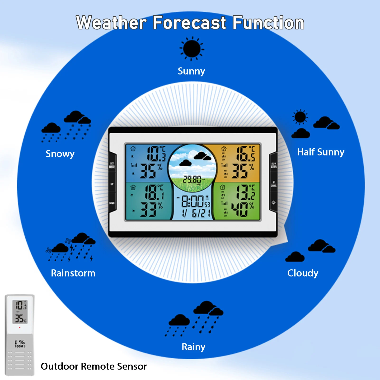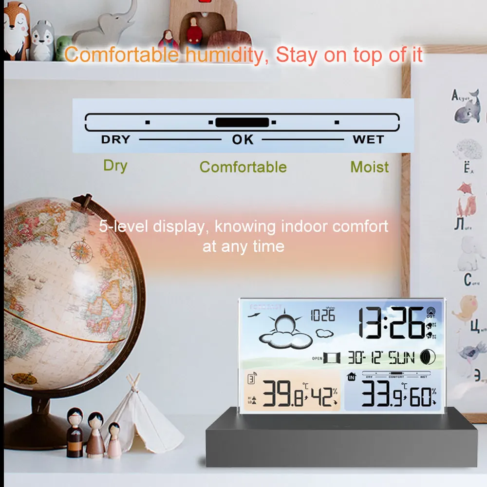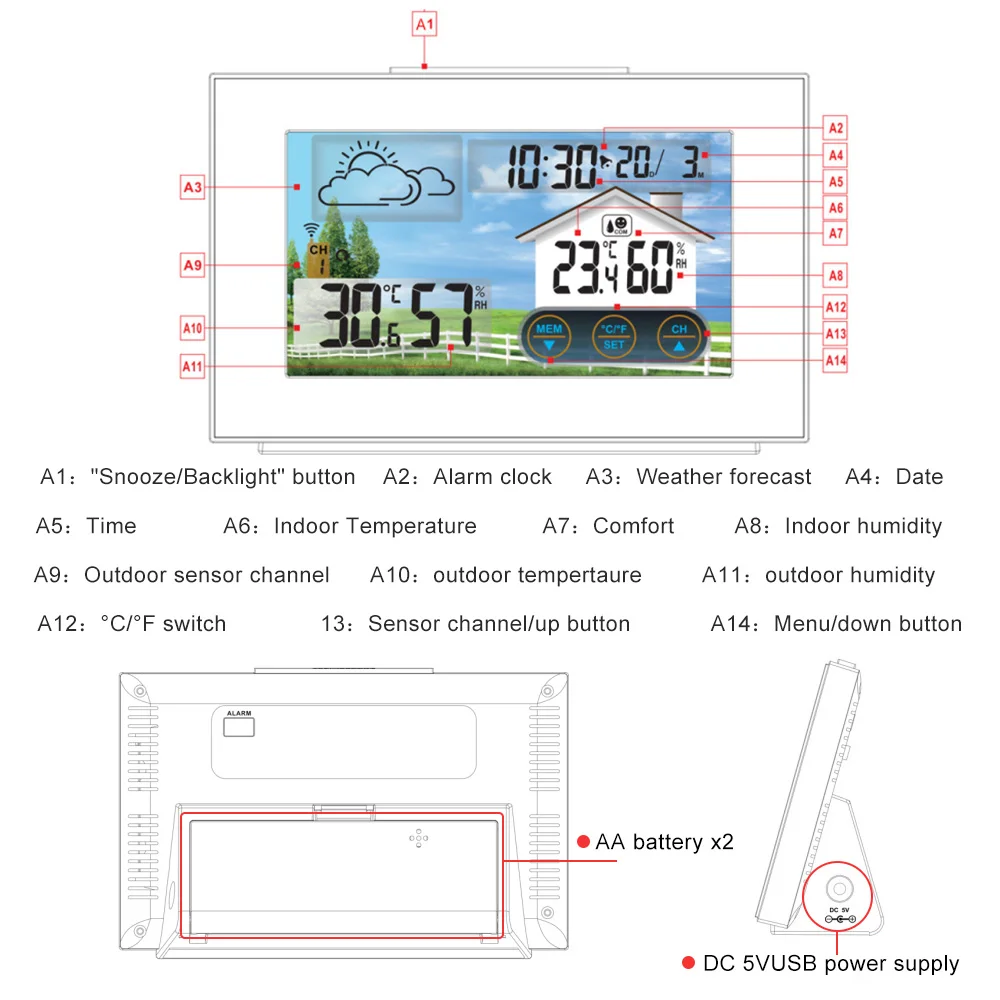 다목적 기상 관측소-대형 LCD 컬러 스크린을 채택하여 실내/실외 온도 및 습도 (최대/분), 온도 및 습도 사용자 정의 (하이/로) 알림, 시간/날짜/주, 이중 알람 시계/스누즈 (추가 5 분 수면), 생생한 일기 예보, 달의 위상, 기압 및 편안함 수준.