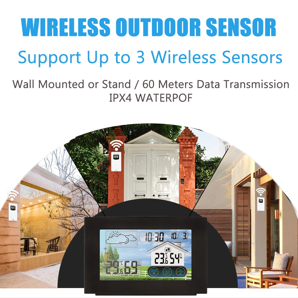 무선 실외 센서: 433.92MHz RF 전송 주파수를 갖춘 벽걸이 형 또는 테이블 스탠드 센서로 개방 구역에서 60 미터 전송 범위를 갖습니다. 최대 3 개의 무선 실외 센서를 연결할 수 있습니다. (패키지에는 무선 실외 센서 1 개 포함)