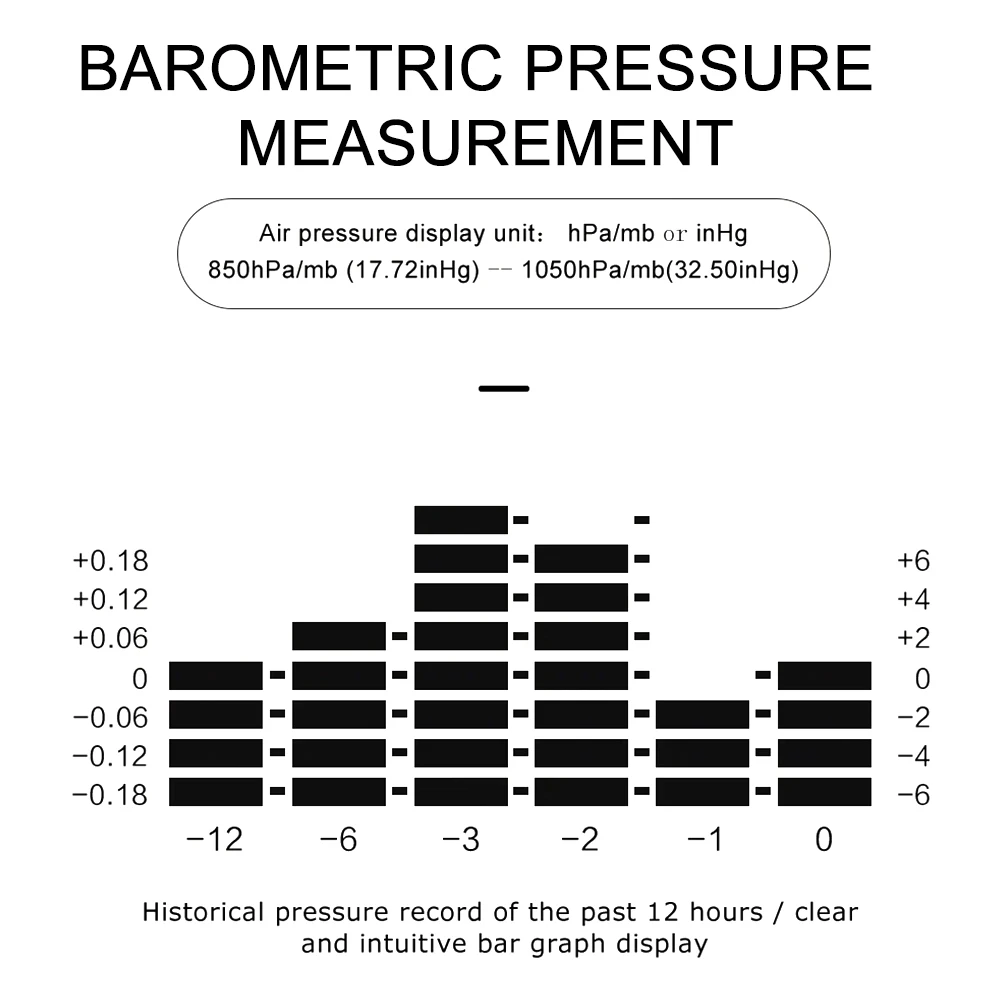 기압 측정 범위: 850 hPa/mb ~ 1050 hPa/mb (25.10 inHg ~ 31.01 inHg)