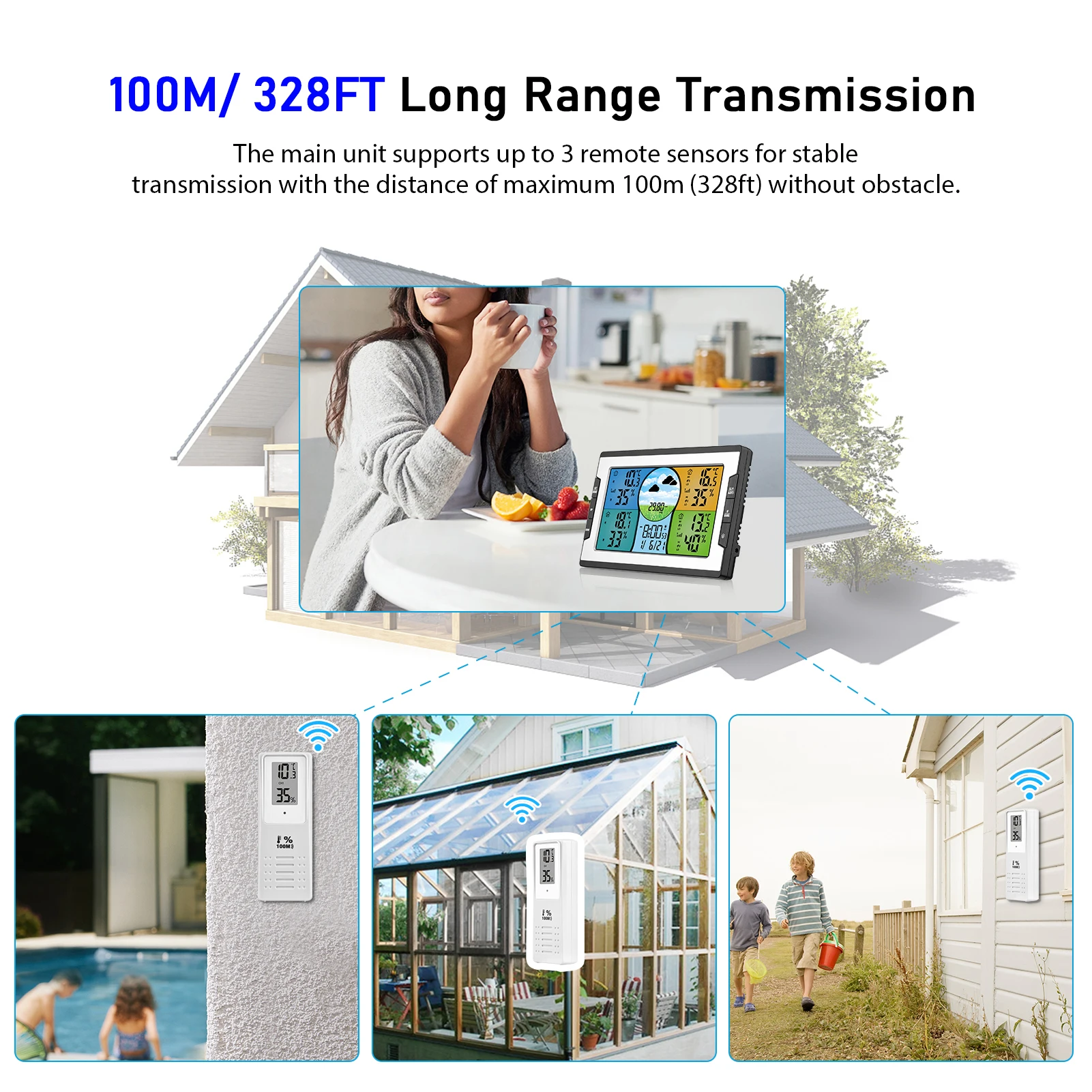 [실내 실외 온습도계]본체는 장애물없이 열린 공간에서 최대 3 개의 원격 센서, 약 100m (328ft) 전송 범위를 지원합니다. 침실, 아기 방, 사무실, 온실, 와인 셀러, 창고 등과 같은 실내 및 실외 장소에 적합합니다. 간편한 설치, 탁상 또는 벽걸이 디자인.