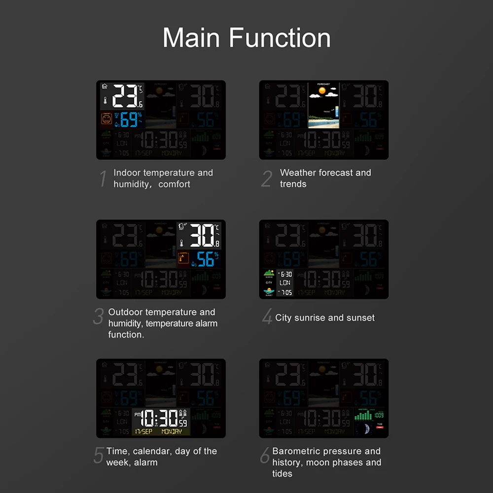 다기능 기상 관측소: 백라이트가있는 대형 터치 스크린, 시간/날짜/달력/온도/습도/기압/달의 위상 및 조수/도시 일출 및 일몰 등을 명확하게 표시합니다.