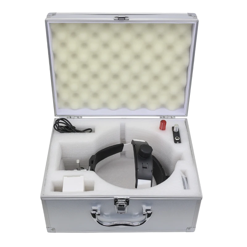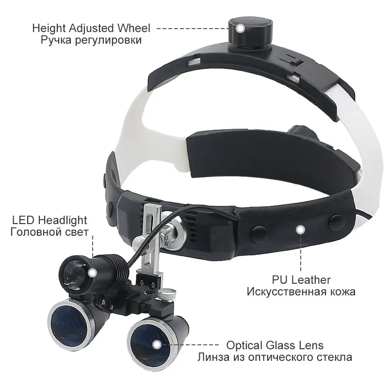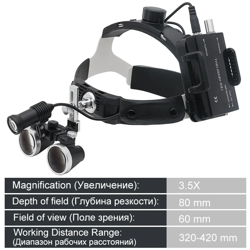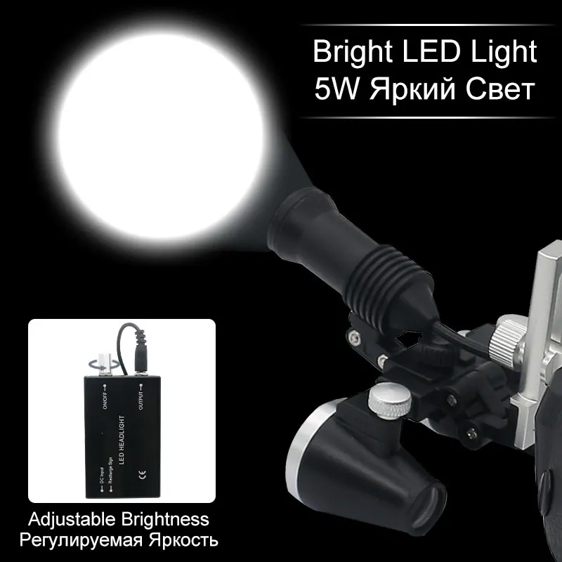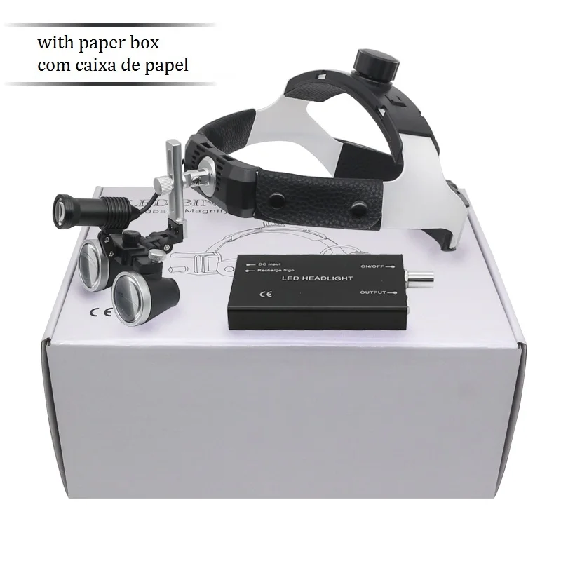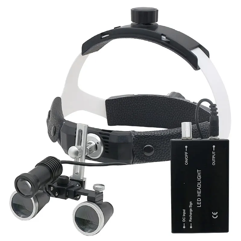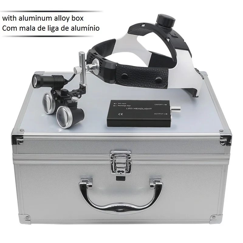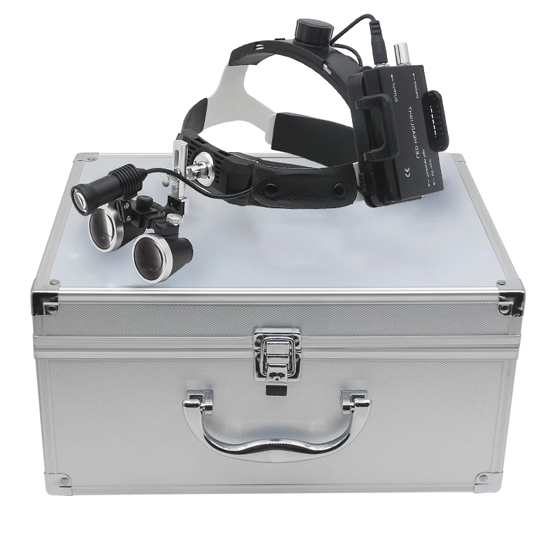 핸즈프리 헬멧 루페 3.5X 치과 쌍안경 돋보기 5W 헤드 라이트, 리튬 배터리 320-420mm 광학 유리 돋보기 알루미늄 합금 상자