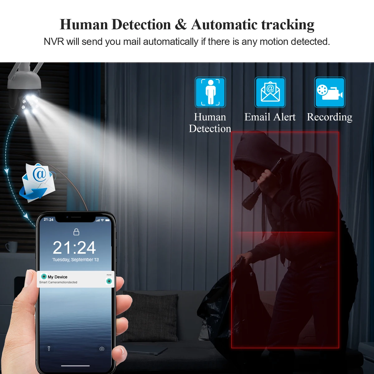 누군가가 촬영 지역에 침입하면 카메라는 침입자를 놀라게하는 소리를 내 보냅니다 (사용자 정의 가능한 알람 소리). 모바일 앱에 알람 메시지를 보내면 4 개의 흰색 LED 조명이 침입자를 비춥니다.